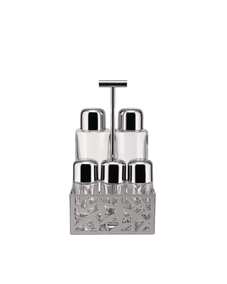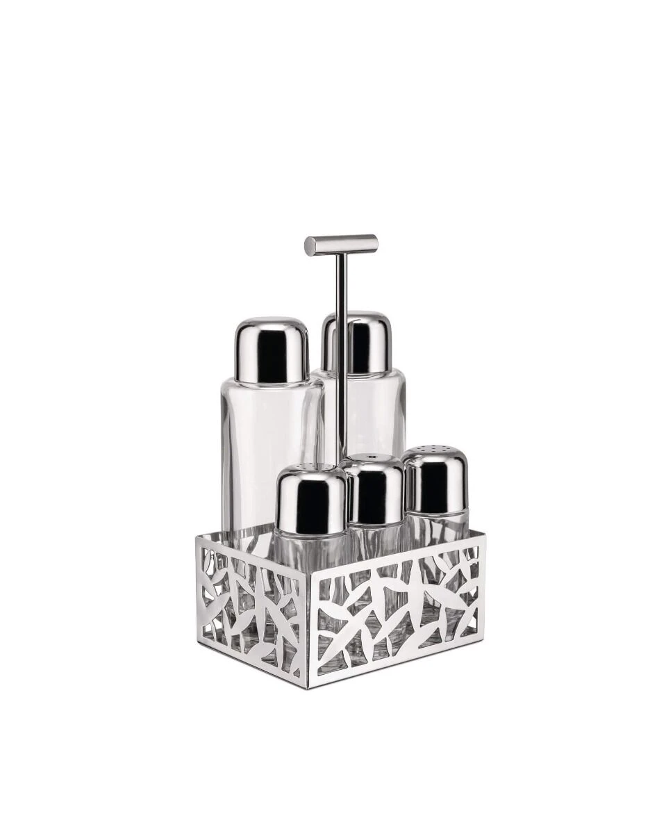 De Alessi Cactus menageset bevat een glazen oliefles, azijnfles, zoutstrooier, peperstrooier en kruidenstrooier in een roestvrijstalen houder met cactussen als versiering. Het menagestel is 21,6 cm hoog, 11,5 cm lang en 9,3 cm breed.