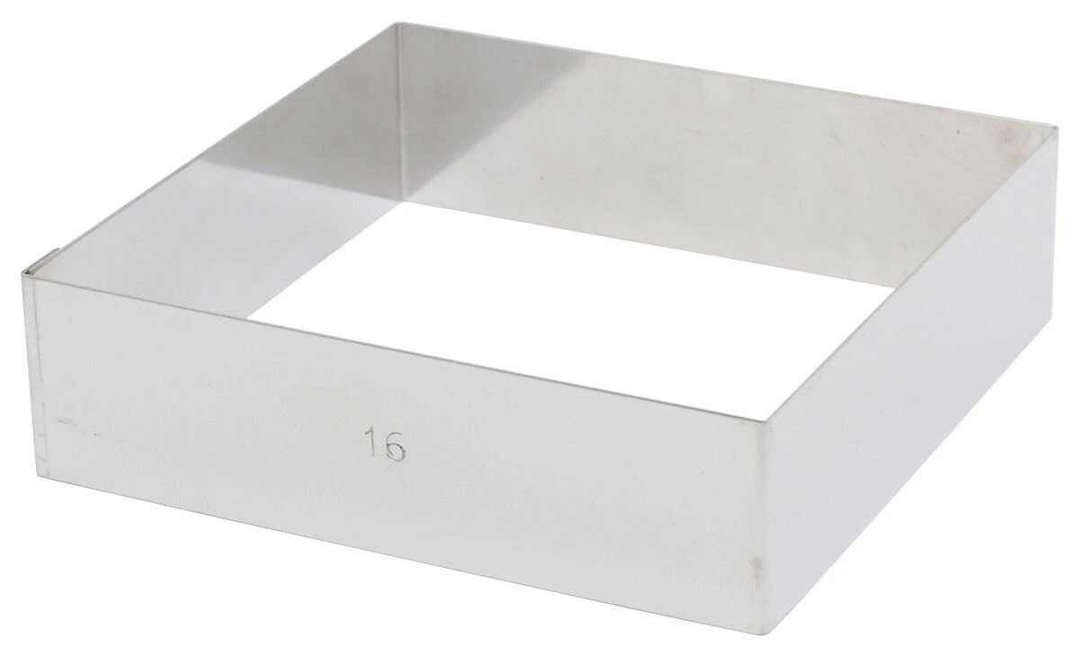 De vierkante taartring van De Buyer is van roestvrij staal met de volgende afmetingen: 16 x 16 x 4,5 cm. Gebruik de ring voor het bakken van vierkante taarten of het uitsteken van deeg.