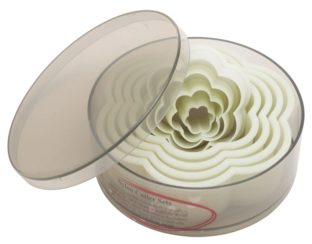 De 8 kunststof uitsteekvormen van Fat Daddio’s zijn bloemvormig en worden geleverd in een opbergdoos. De uitsteekvormen zijn voorzien van een dikke bovenrand om voldoende kracht te kunnen zetten. Gebruik de vormen voor het uitsteken van deeg, fondant of marsepein.