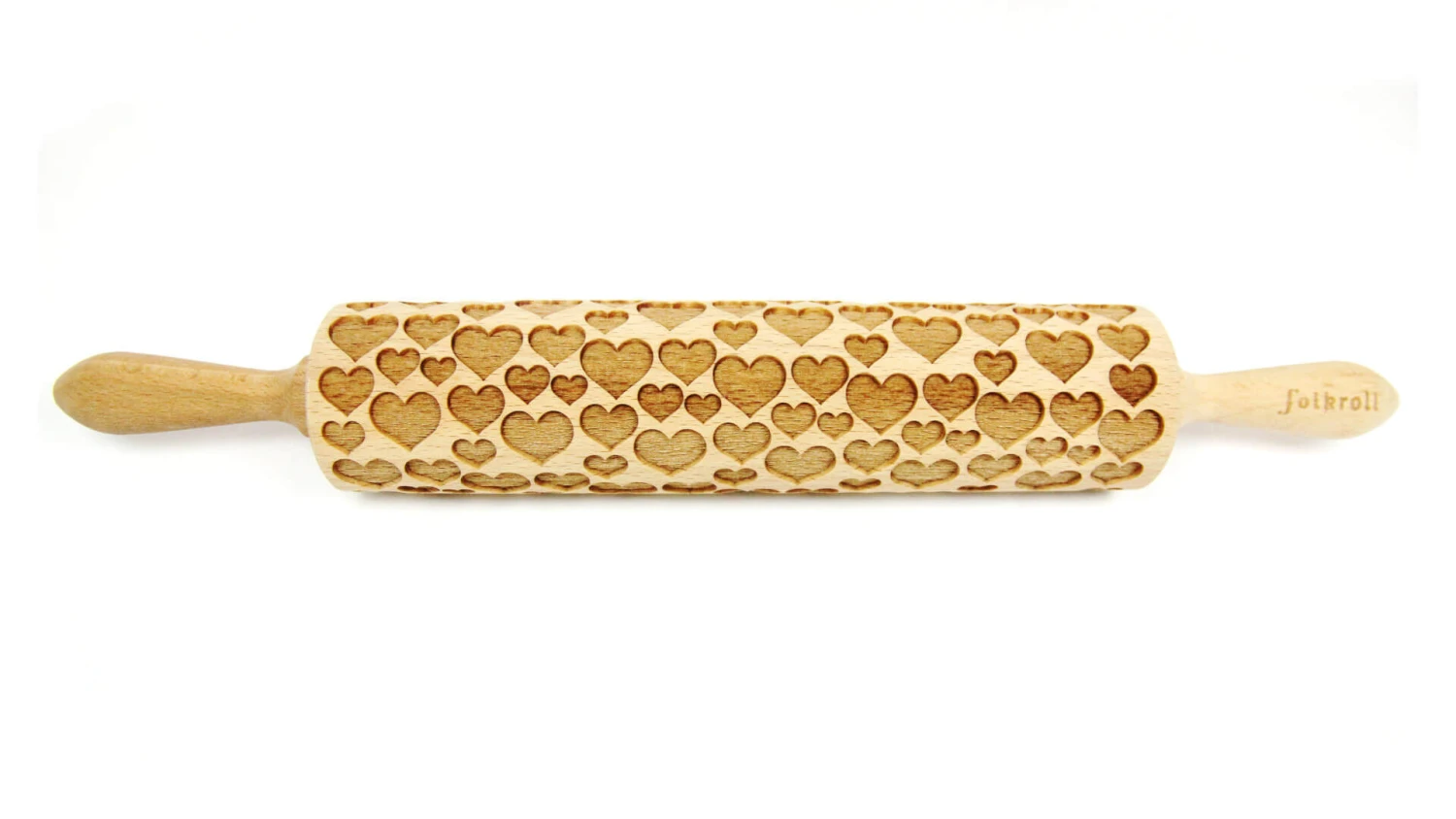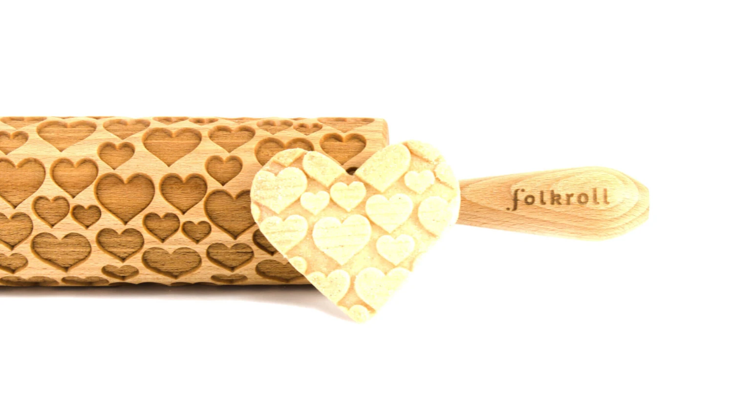 De Folkroll-deegroller met het patroon Hearts is vervaardigd uit beukenhout. Het bedrukte deel van de deegroller is 25 cm lang, en heeft een diameter van 6 cm. De gehele deegroller heeft een lengte van 43 cm. Gebruik de Folkroll-deegroller voor het decoreren van koekjesdeeg, chocolade, suiker, marsepein, zout, keramiek of kleiproducten.
