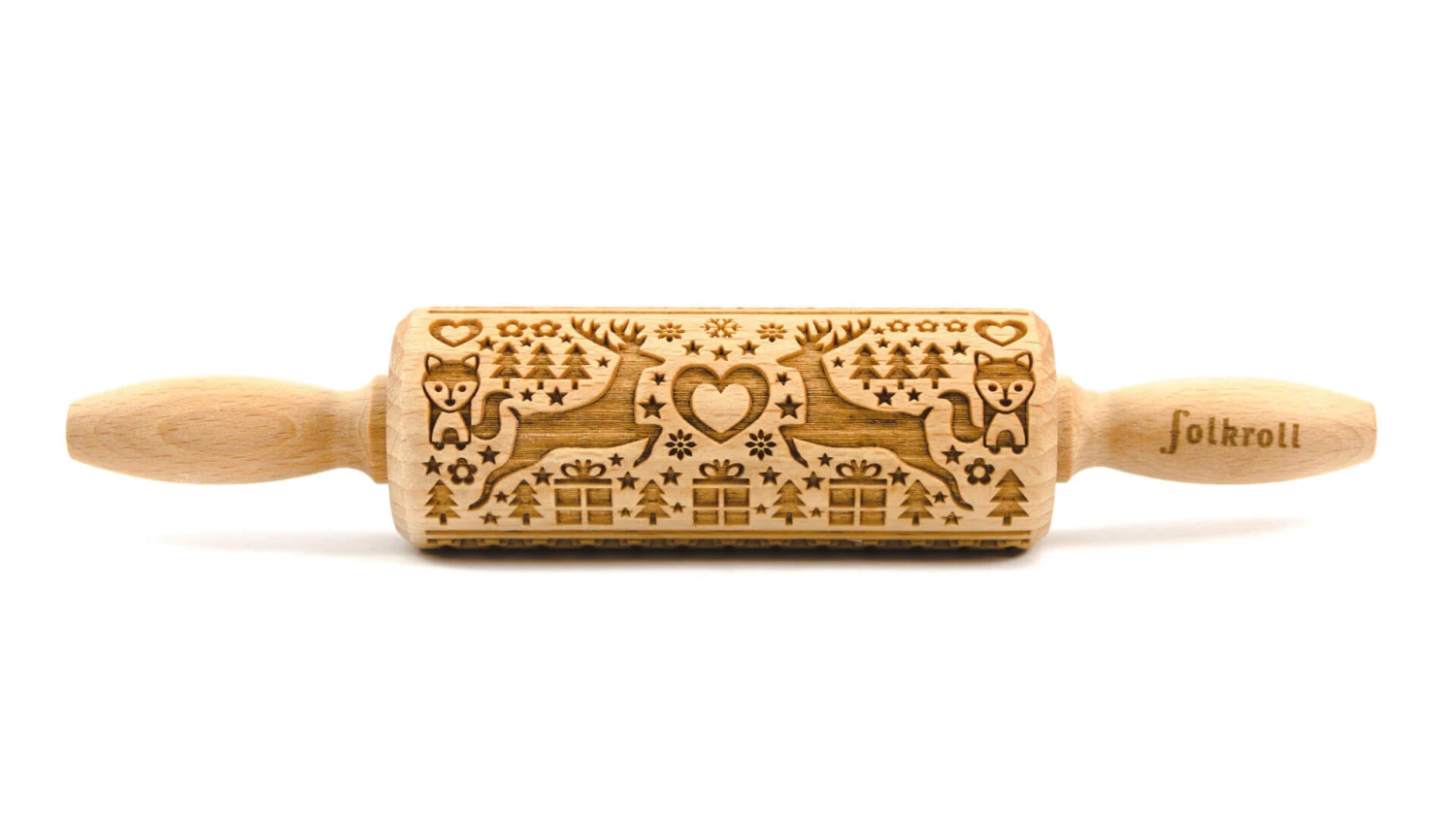 De Folkroll Junior-deegroller met het patroon Magic Christmas is vervaardigd uit beukenhout. Het bedrukte deel van de deegroller is 11,5 cm lang, en heeft een diameter van 4,5 cm. De gehele deegroller heeft een lengte van 23 cm. Gebruik de Folkroll-deegroller voor het decoreren van koekjesdeeg, chocolade, suiker, marsepein, zout, keramiek of kleiproducten.