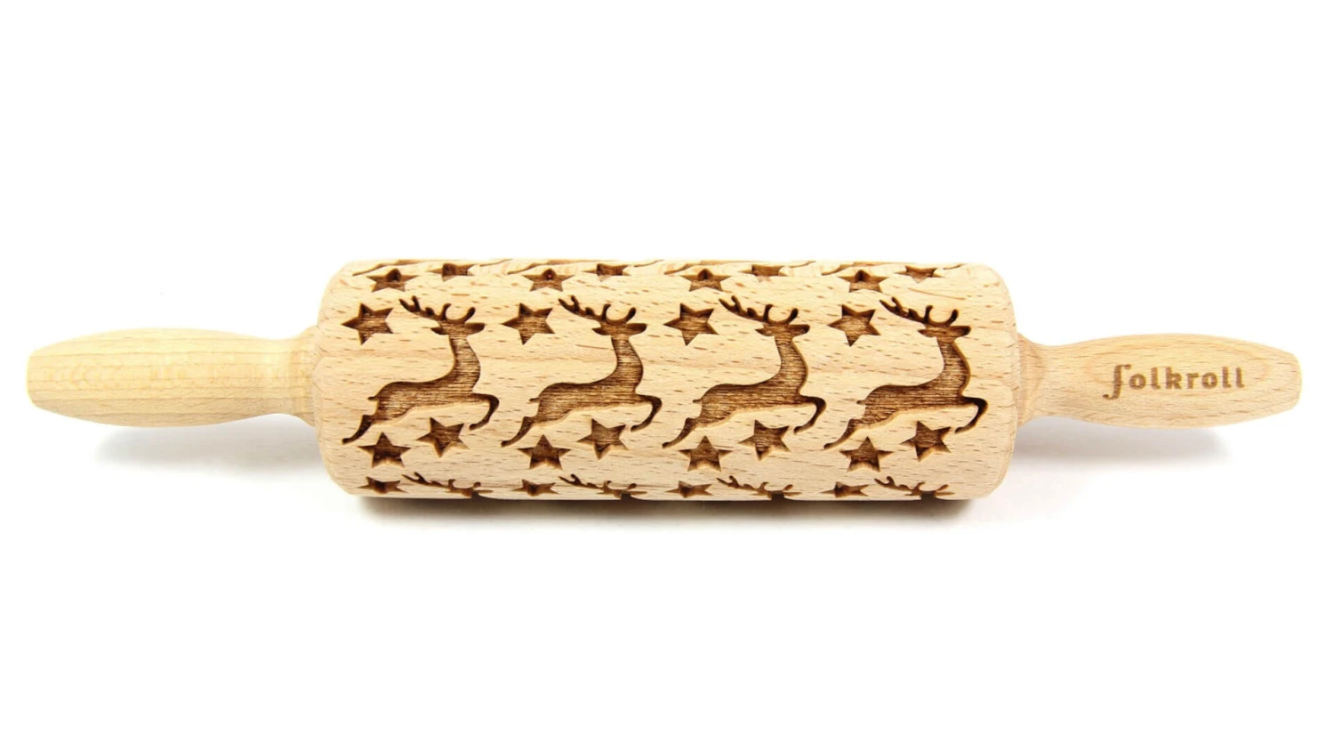 De Folkroll Junior-deegroller met het patroon Reindeer Stars is vervaardigd uit beukenhout. Het bedrukte deel van de deegroller is 11,5 cm lang, en heeft een diameter van 4,5 cm. De gehele deegroller heeft een lengte van 23 cm. Gebruik de Folkroll-deegroller voor het decoreren van koekjesdeeg, chocolade, suiker, marsepein, zout, keramiek of kleiproducten.