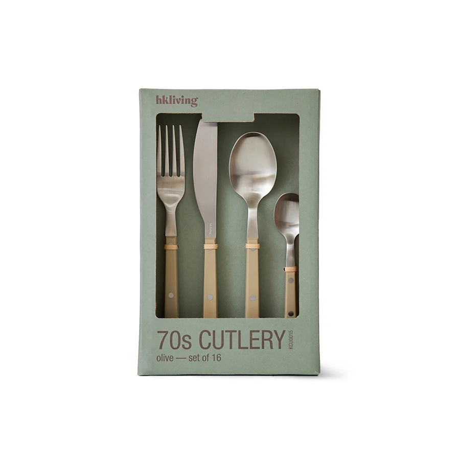 De HK Living 70’s bestekset bestaat uit 4 vorken, 4 messen, 4 eetlepels en 4 theelepels. Het bestek is gemaakt van roestvrij staal met een kunststof handgreep. Het bestekset is ideaal voor dagelijks gebruik. Voor een jaren 70 look aan je servies is deze set perfect.