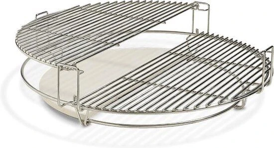 Het Keij divide and conquer grillrek is geschikt voor gebruik op 23 inch Kamado’s. De verpakking bestaat uit 1 divide and conquer frame, 2 roestvrij stalen half moon grillrekken, 2 half moon keramieken deflector platen en 1 accessoire ring waar een dutch oven in kan worden gehangen of een wok op kan worden gezet. Dit rek kunt u perfect gebruiken om gelijktijdig direct en indirect te grillen. Bovendien verdubbelt u met deze set eenvoudig het grilloppervlak.
