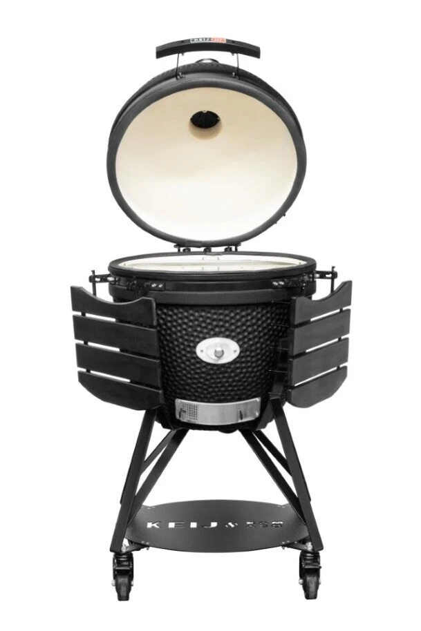 De Keij Kamado Legend XL barbecue is een mat zwarte kamado van hoge kwaliteit. De Legend XL barbecue heeft een grilloppervlak met een diameter van 49 cm. Gebruik de barbecue het hele jaar door om te grillen, bakken, koken, slow cooken, roken of stoven. De Keij Kamado Legend XL wordt geleverd met een onderstel gemaakt van stevig staal, HDPE handvatten en zijtafels, een ingebouwde thermometer, een chipfeeder, een uitschuifbare aslade, een beschermhoes en het flexibele Divide & Conquer grillsysteem.