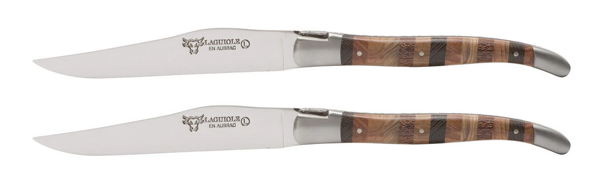De Laguiole en Aubrac steakmessenset bestaat uit 2 messen met een messenstalen lemmet van 11,5 cm. Het totale mes heeft een lengte van 23 cm. Het heft van het mes is van verschillende houtsoorten. U gebruikt het steakmes met de gladde snede voor het snijden van bereid vlees aan tafel.