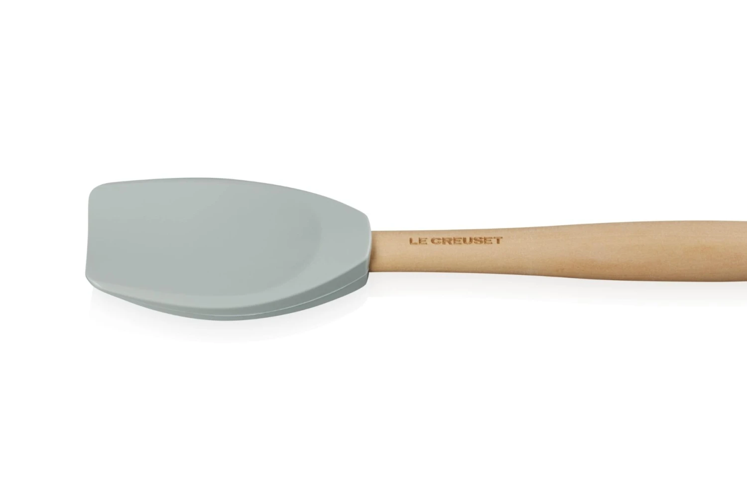 De Sea Salt, lichtblauw/groene Le Creuset grote spatel is gemaakt van hout en heeft een siliconen blad, waardoor de spatel niet krast. De spatel heeft een platte en bolle zijde en heeft een lengte van 28 cm. De breedte van het blad is 7 cm.