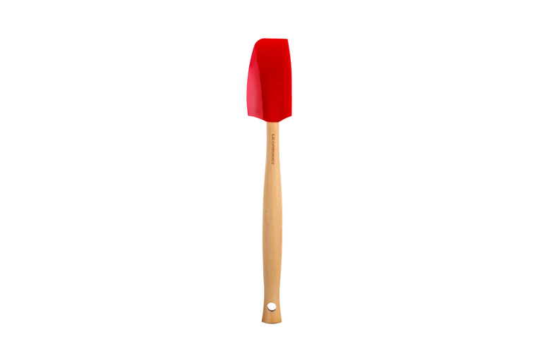 De kersrode Le Creuset kleine spatel is gemaakt van hout en heeft een siliconen blad, waardoor de spatel niet krast. De spatel heeft een platte en bolle zijde en heeft een lengte van 28 cm. De breedte van het blad is 4,5 cm.