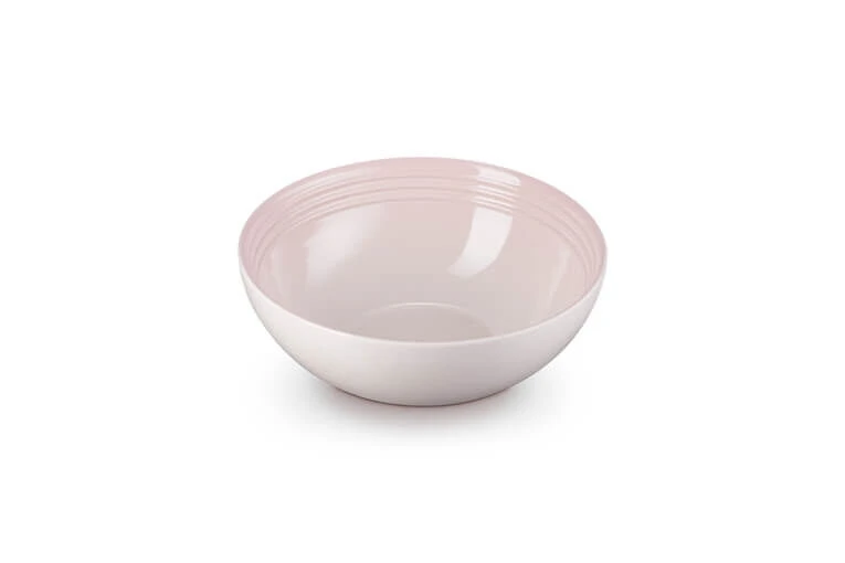 De ronde schaal van Le Creuset is gemaakt van shell pink, roze, geglazuurd aardewerk. De diameter van de schaal is 24 cm en heeft een inhoud van 2,2 liter. Gebruik de schaal om bijvoorbeeld een salade in te serveren.