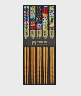 De Oldenhof eetstokjes zijn gemaakt van donkerbruin hout met een motief van katten en hebben een lengte van 22,5 cm. De stokjes komen in een verpakking met 5 sets van 2 eetstokjes. Gebruik de eetstokjes voor het eten van Aziatische gerechten als sushi of noedels.