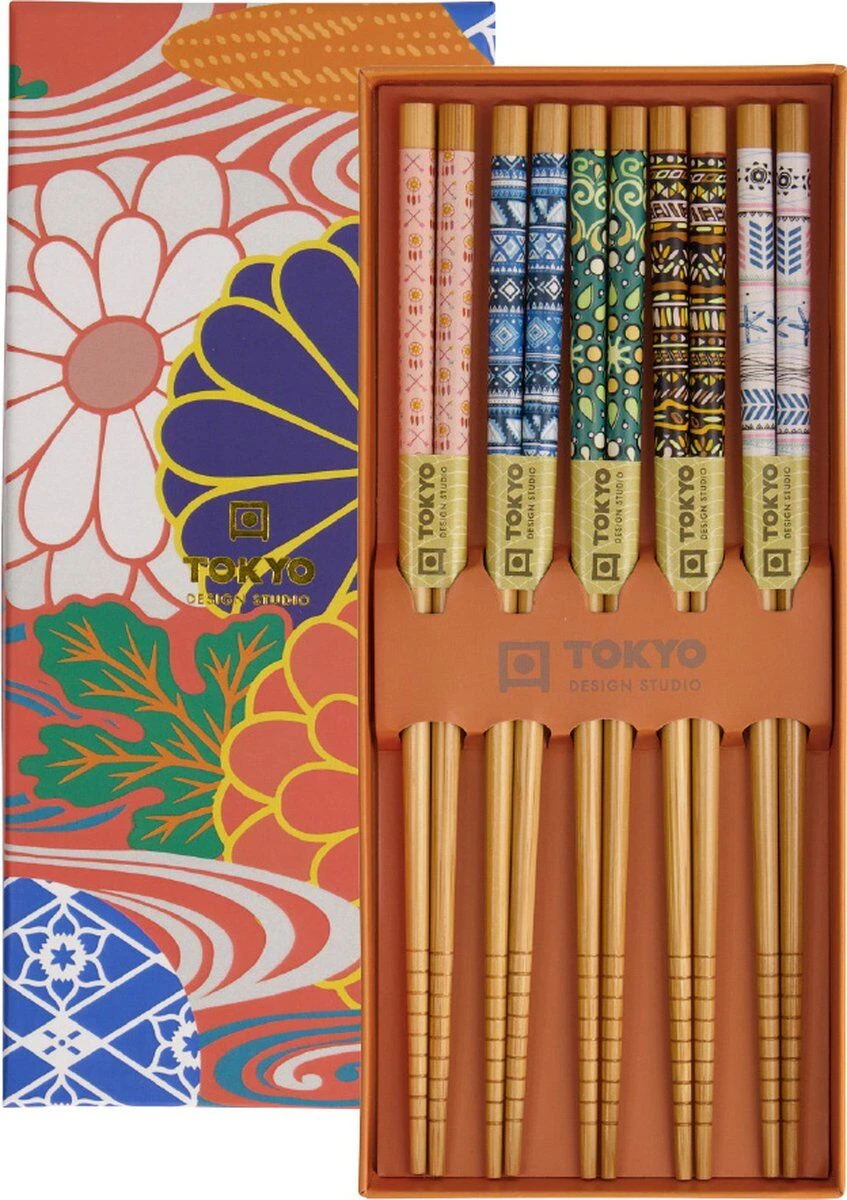 De Oldenhof eetstokjes zijn gemaakt van bruin hout met een verschillende patronen in verschillende kleuren. De stokjes hebben een lengte van 22,5 cm en komen in een luxe doosje met 5 sets van 2 eetstokjes. Gebruik de eetstokjes voor het eten van Aziatische gerechten als sushi of noedels.
