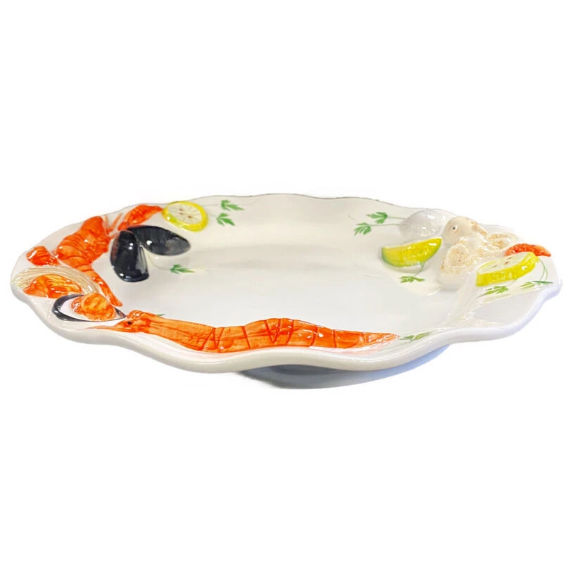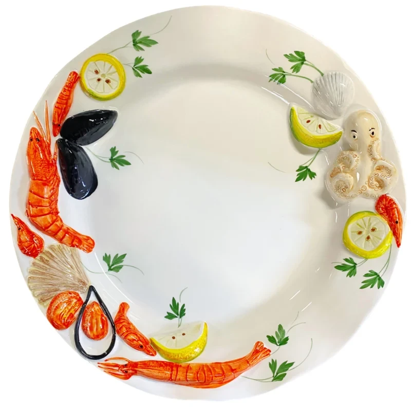 De Oldenhof Frutti di mare schaal met ribbel is voorzien van handgeschilderde schelpen en zeedieren. De schaal is gemaakt van keramiek en heeft een diameter van 38 cm. Gebruik het design als decoreer- en serveerschaal.