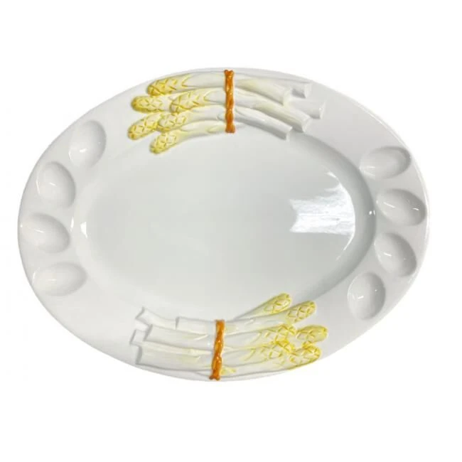 De crèmekleurige Oldenhof aspergeschaal heeft een afmeting van 47 x 36 cm en biedt voldoende ruimte voor een ruime portie gekookte asperges en acht eitjes. De rand van de aardewerken schaal is gedecoreerd met een aspergeprint in voelbaar reliëf. Gebruik de Oldenhof aspergeschaal voor het serveren van uw favoriete aspergebereiding en acht gekookte eieren.