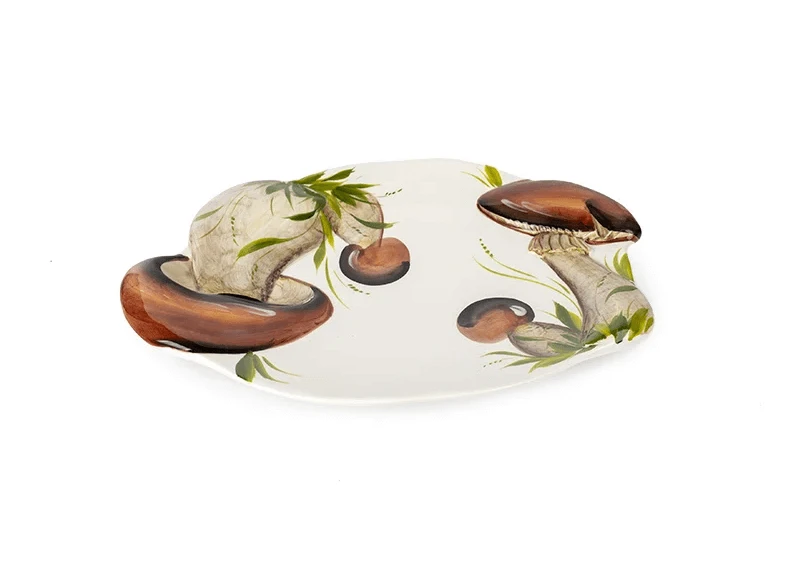 De ovale Oldenhof schaal is gemaakt van wit aardewerk en is gedecoreerd met paddenstoelen. De lengte van de schaal is 45 cm en de breedte is 30 cm. Gebruik de presenteerschaal voor herfstige gerechten.