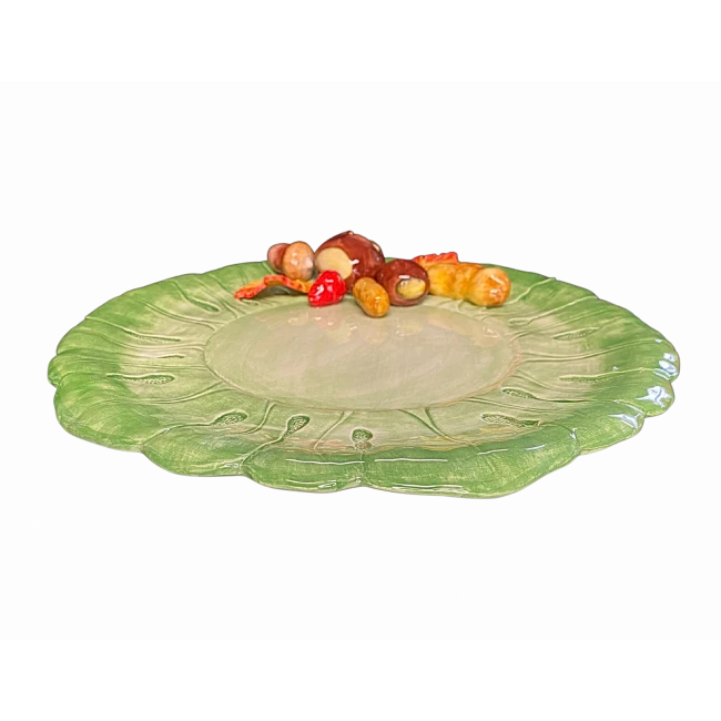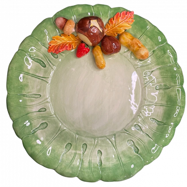 De Oldenhof kastanje persenteerschaal is voorzien van handgeschilderde kastanjes, bladeren en eikeltjes. De schaal is gemaakt van aardewerk en heeft een diameter van 32 cm. Gebruik het design als decoreer- en serveerschaal.