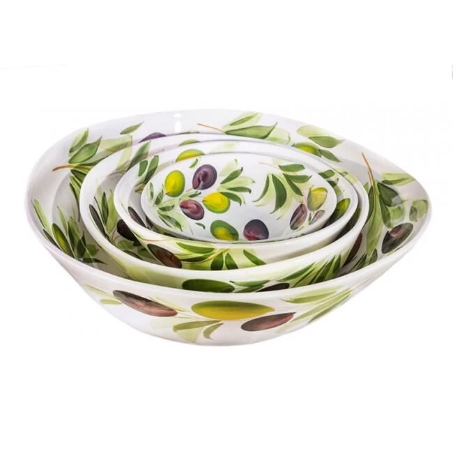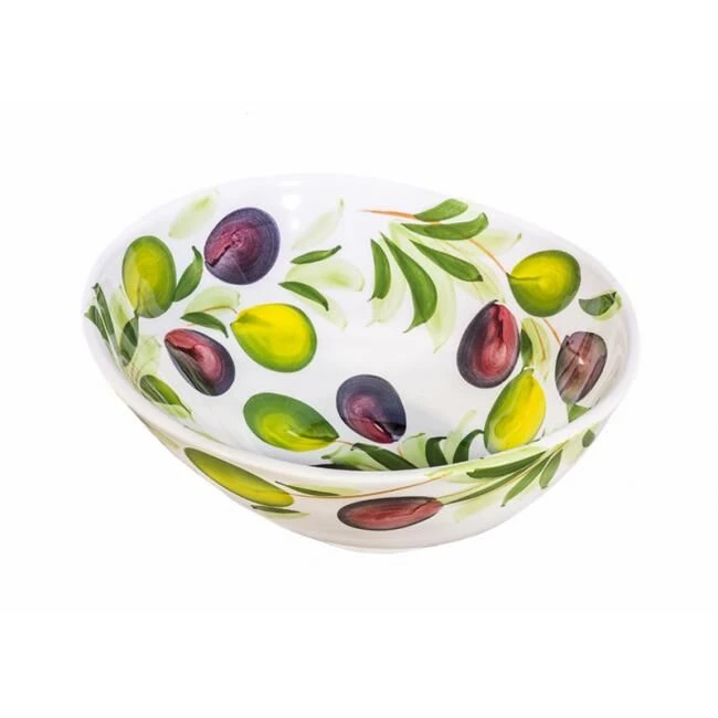 De organische Oldenhof schaal is gemaakt van wit aardewerk en is gedecoreerd met olijven. De diameter van de schaal is 20 cm en de hoogte is 8 cm. Gebruik de presenteerschaal voor salades of andere bijgerechten.
