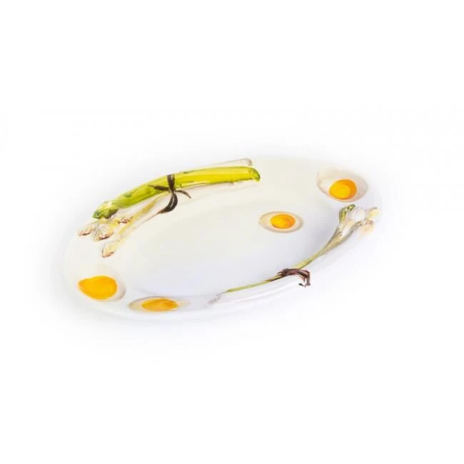 De witte Oldenhof aspergeschaal biedt voldoende ruimte voor een ruime portie gekookte asperges. De rand van de aardewerken schaal is gedecoreerd met een aspergeprint en over de schaal zijn enkele halve gekookte eieren te zien. Gebruik de Oldenhof aspergeschaal voor het serveren van uw favoriete aspergebereiding.