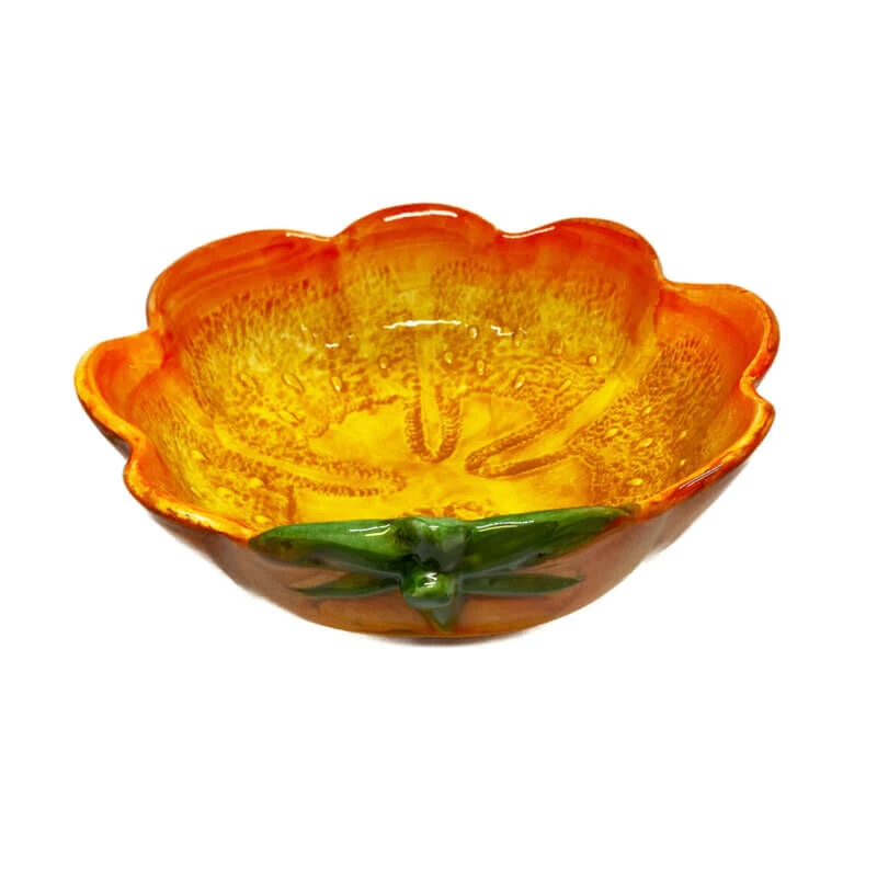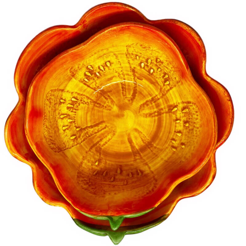 De Oldenhof pompoen kom is gemaakt van oranje aardewerk en heeft een diameter van 27 cm. De ronde schaal ziet eruit als een halve pompoen en kan gebruikt worden voor het maken en serveren van verschillende salades en andere gerechten.