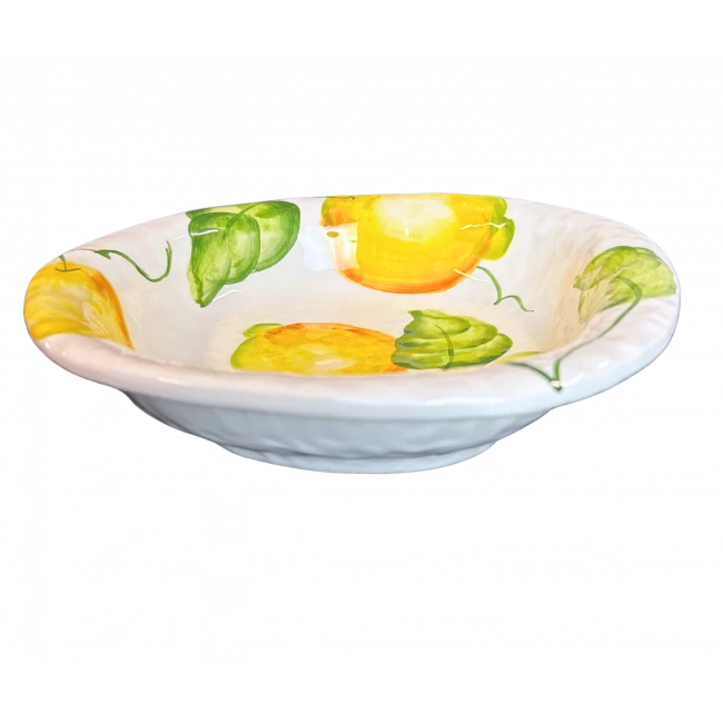 De Oldenhof Turijn olijf citroen diepe schaal is gemaakt van wit aardewerk en is gedecoreerd met citroenen. De schaal heeft een diameter van 18 cm. Gebruik de schaal om verschillende gerechten in stijl te serveren en presenteren.