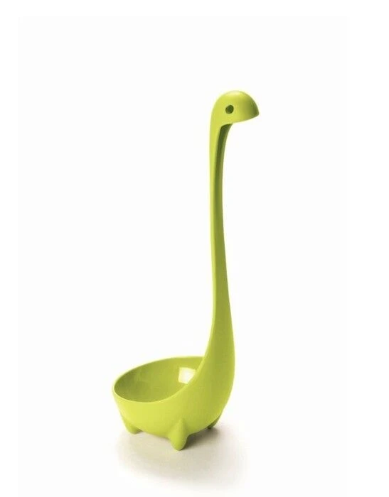 De Nessie soeplepel van Ototo is gemaakt van groen nylon. De lepel is vormgegeven als het Monster van Loch Ness, met een diepe schep. Nessie is 24,5 cm hoog, 9 cm lang en 8 cm breed. Gebruik de soeplepel om soep uit de pan te scheppen. Door de pootjes blijft Nessie rechtop staan.