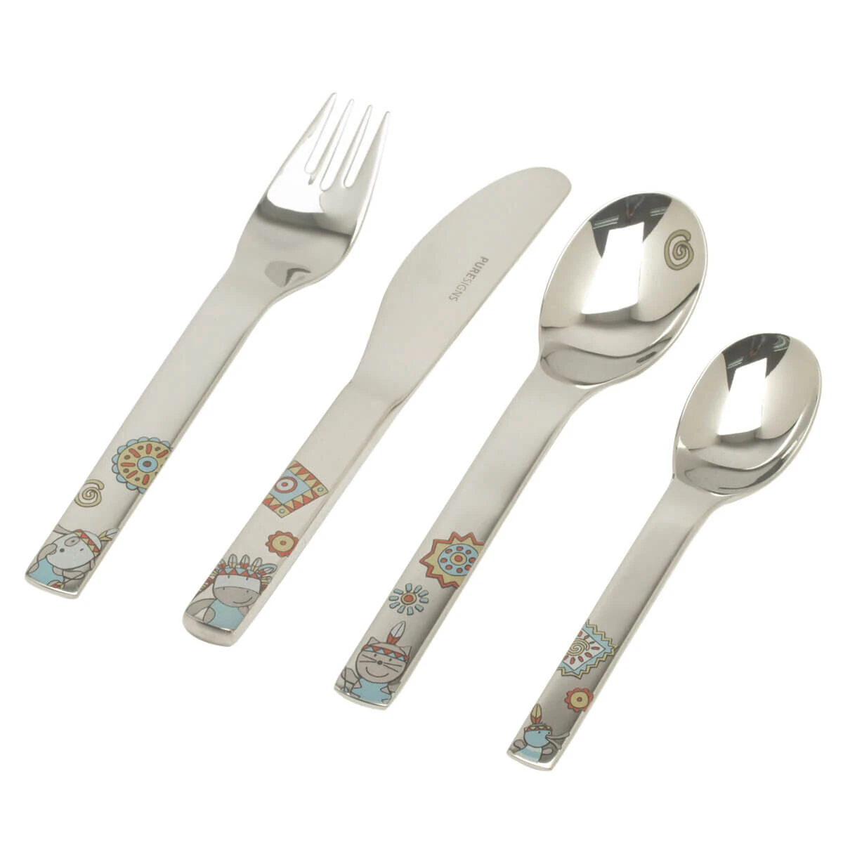 Het Puresigns One Moema kinderbestek is vervaardigd uit glanzend roestvrij staal. Dit bestek is de kinderversie van het Puresigns One bestek en is voorzien van een indianen-print.