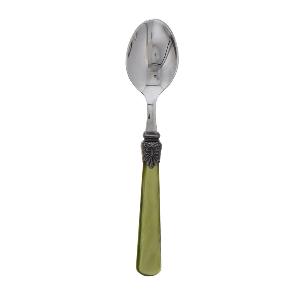 De Rivadossi Sandro Elena tafellepel is gemaakt van roestvrij staal, met een heft van groen acryl. Het heft is voorzien van een decoratief element. Gebruik de lepel voor het eten van diverse gerechten.