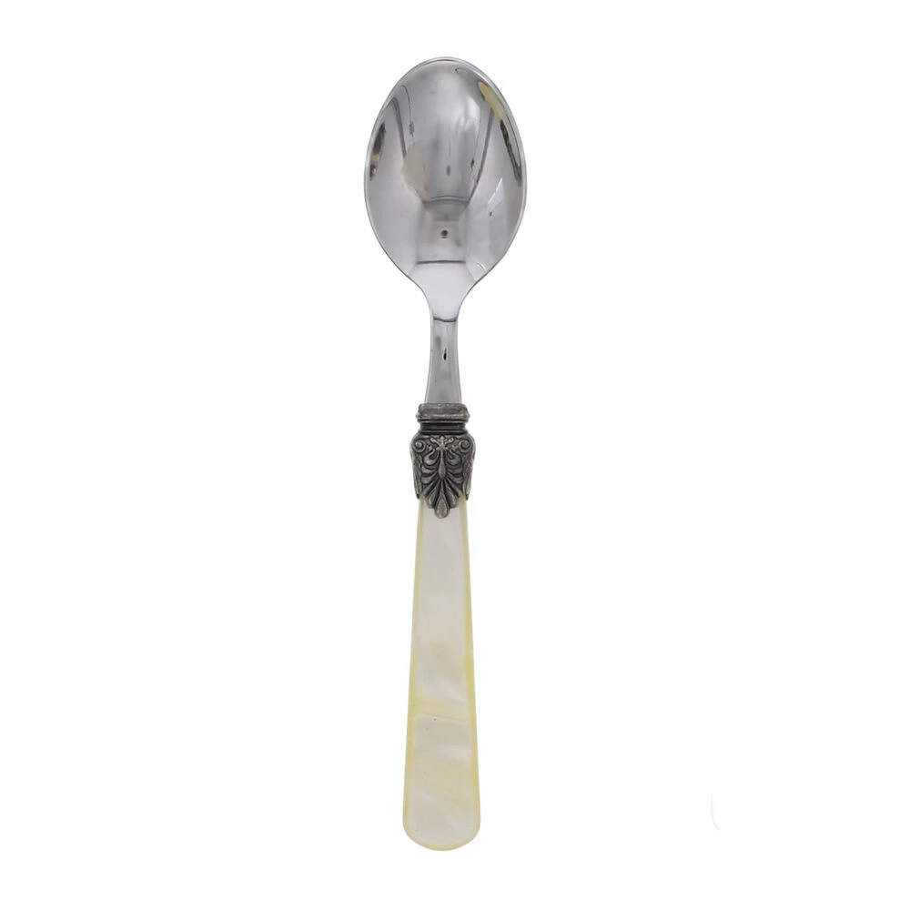 De Rivadossi Sandro Elena tafellepel is gemaakt van roestvrij staal, met een heft van ivoor acryl. Het heft is voorzien van een decoratief element. Gebruik de lepel voor het eten van diverse gerechten.