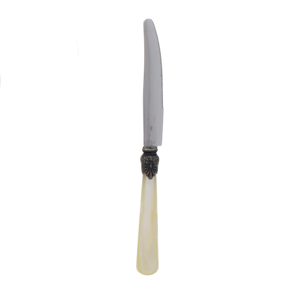 Het Rivadossi Sandro Elena tafelmes is gemaakt van roestvrij staal, met een heft van ivoor acryl. Het heft is voorzien van een decoratief element. Gebruik het mes voor het snijden van diverse gerechten.
