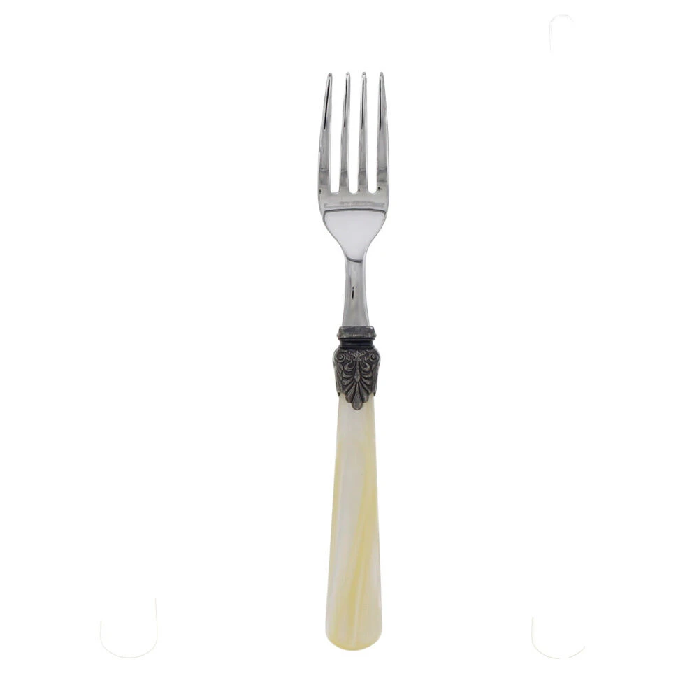 De Rivadossi Sandro Elena tafelvork is gemaakt van roestvrij staal, met een heft van ivoor acryl. Het heft is voorzien van een decoratief element. Gebruik de vork voor het eten van diverse gerechten.
