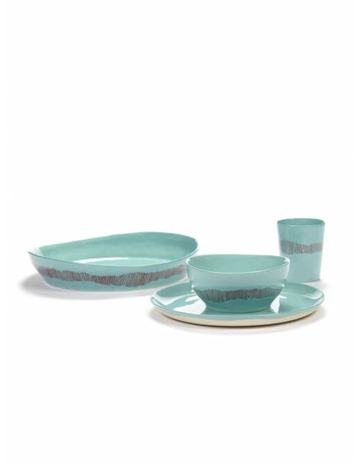 Het Serax Feast by Ottolenghi serveerschaal heeft een diameter van 30 cm en is 6 cm hoog. Het aardewerken bord is turquoise van kleur en heeft een rode schildering.