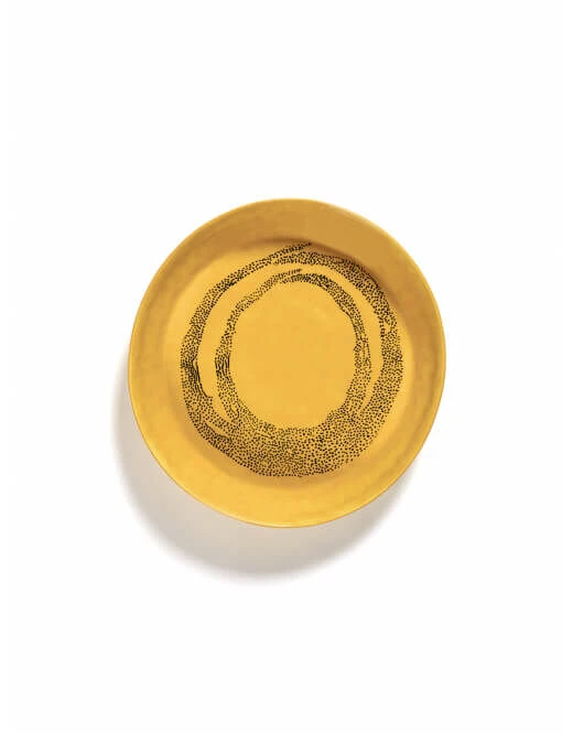 Het Serax Feast by Ottolenghi serveerschaal heeft een diameter van 30 cm en is 6 cm hoog. Het aardewerken bord is geel van kleur en heeft een zwarte schildering.
