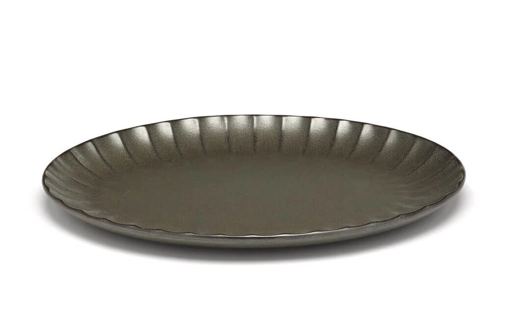 Het ovale bord S van Serax INKU heeft een diameter van 25 x 17,5 cm en is 1,7 cm hoog, en is aan de rand voorzien van een decoratief ribbelpatroon. Het bord is gemaakt van steengoed (aardewerk) en is groen geglazuurd. Gebruik voor het serveren van gerechten.