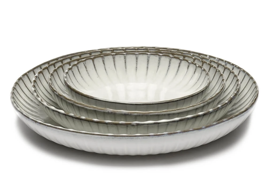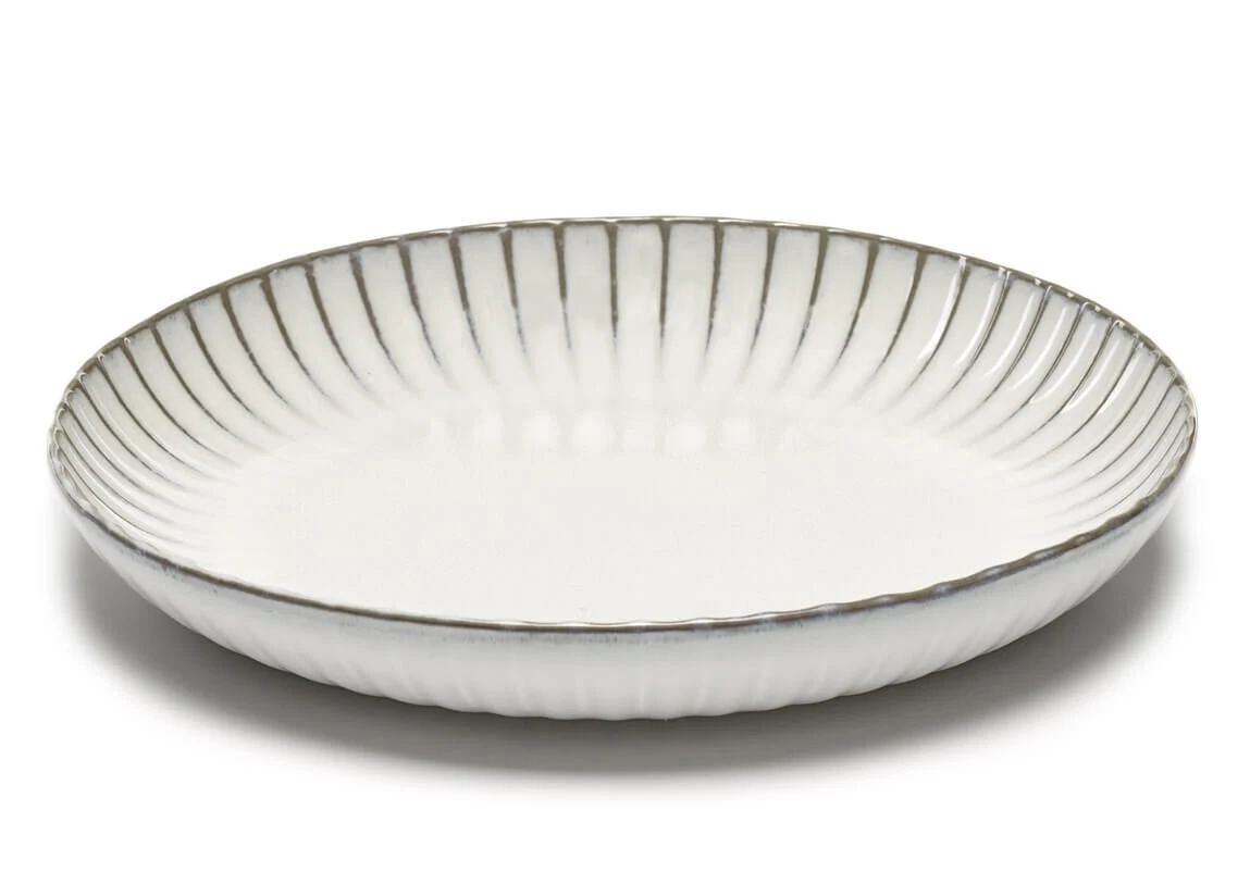 De serveerschaal M van Serax INKU heeft een diameter van 32 cm en is 5 cm hoog, en is aan de rand voorzien van een decoratief ribbelpatroon. De schaal is gemaakt van steengoed (aardewerk) en is wit geglazuurd. Gebruik voor het serveren van gerechten.