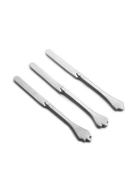 De Serax Merci Mix 1-2-3 dessertmessen zijn gemaakt van roestvrij staal dat een stonewash-behandeling heeft gehad. Elk van de drie delen heeft een ander einde van de handgreep. Dek het mes in voor het nagerecht.
