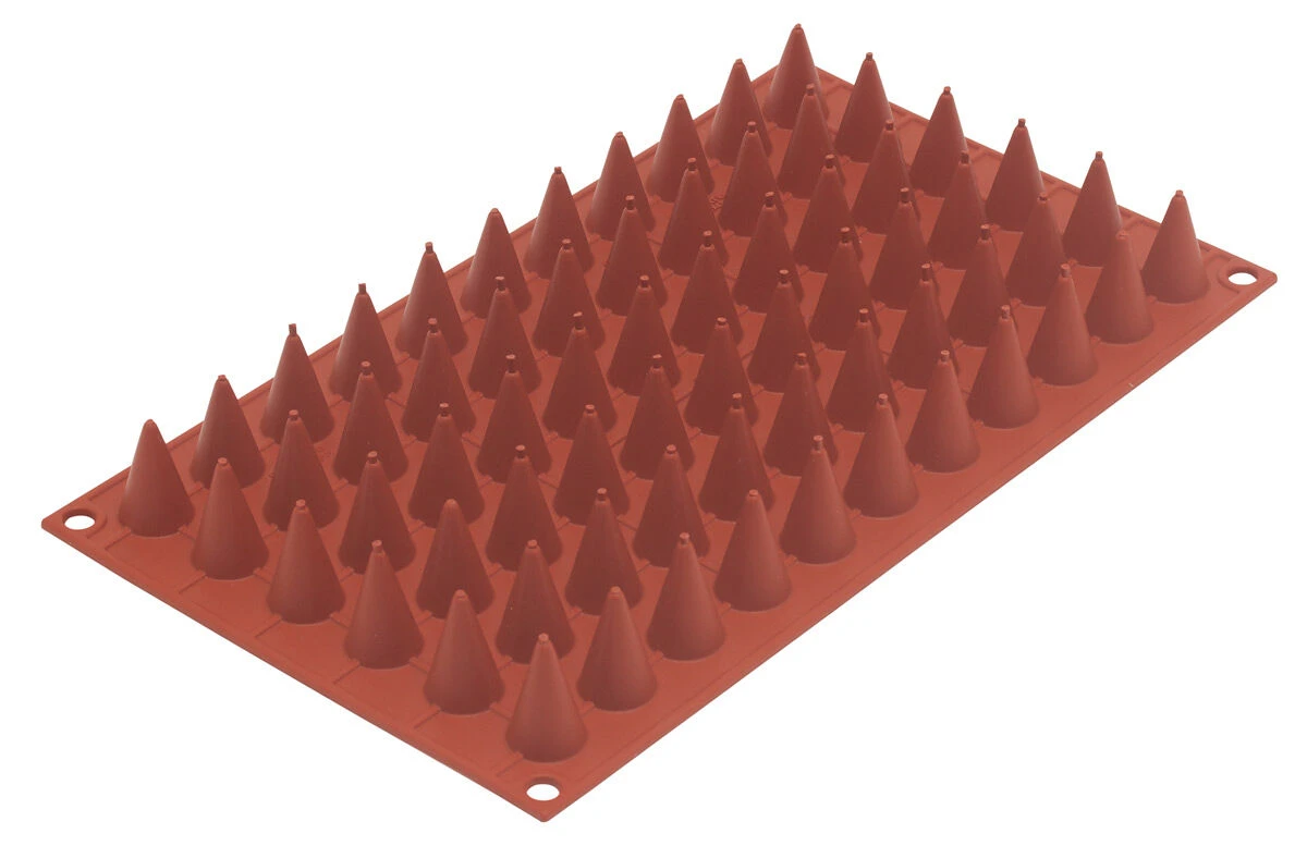 De Silikomart siliconen bakvorm bevat 66 kegels. Iedere afzonderlijke kegel heeft een diameter van 1,8 cm, is 30 mm hoog en heeft een inhoud van 33 ml. De flexibele bakmat is in zijn geheel 30 cm lang, 17 cm breed en heeft een totale inhoud van 2,2 liter.