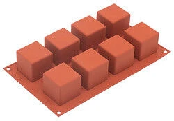 De Silikomart bakvorm bevat 8 kubussen van elk 5 cm lang, breed en hoog. De inhoud per kubus bedraagt 125 ml. De van flexibel silicone gemaakte bakmat is in zijn geheel 30 cm, 17 cm breed met een totale inhoud van 1 liter.
