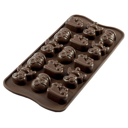 De Silikomart EasyChoc Choco Winter bakvorm is gemaakt van bruin silicone en heeft een afmeting van 21 bij 11 cm. De vormpjes – 4 x kerstman, 4 x sneeuwpop, 4 x arrenslee en 4 x rendier – hebben een inhoud van circa 7,5 ml. Maak bijvoorbeeld bonbons of snoepjes. De vorm wordt geleverd met een receptenboekje.