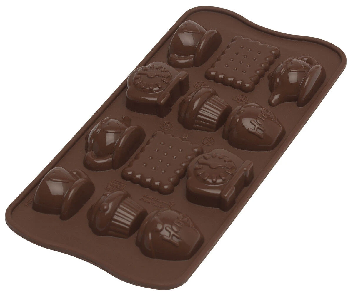 De Silikomart EasyChoc Tea Time bakvorm is gemaakt van bruin silicone en heeft een afmeting van 21 bij 11 cm. De vormpjes – 2 x theepot, 2 x biscuit, 2 x kopje, 2 x cupcake, 2 x klok en 2 x honingpot – hebben een inhoud van circa 7,5 ml. Maak bijvoorbeeld bonbons of snoepjes. De vorm wordt geleverd met een recepten.