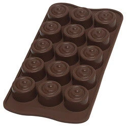 De Slikomart EasyChoc ‘Vertigo’ is een siliconen bonbonvorm voor het maken van cilindervormige chocolaatjes. Elk van de cilinders heeft een diameter van 2,8 cm en een inhoud van 10 ml. De gehele vorm is 21 cm lang en 11 cm breed, met een totale inhoud van 150 ml.