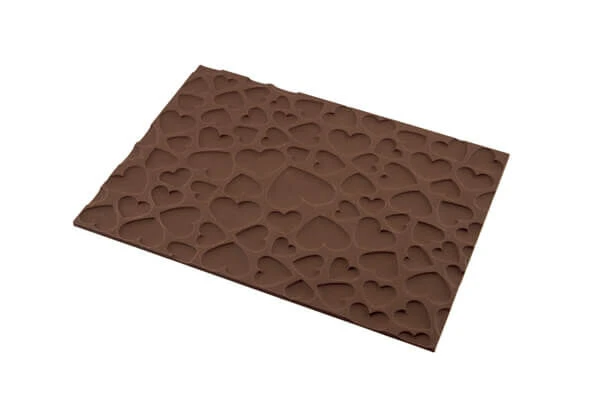 De Silikomart structuurmat Magic Love is 25 cm lang en 18,5 cm breed en gemaakt van bruin silicone. De mat heeft een structuur van harten die kan worden overgebracht op puddingen, gebak en fondant of marsepein.