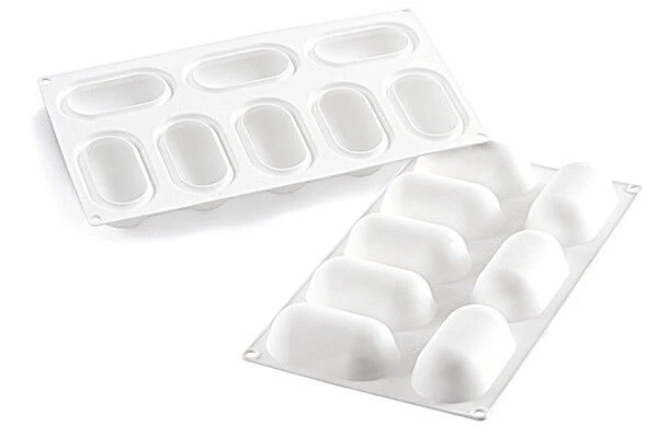 De Silikomart flexibele bakvorm heeft 8 vormen van kussenachtige cilinders. Afzonderlijk hebben de vormen een lengte van 8,2 cm, een breedte van 4,3 cm en een hoogte van 3,2 cm met een inhoud van 80 ml. De gehele vorm is 30 cm lang en 18 cm breed met een totale inhoud van 640 ml. De bakvorm wordt geleverd met een speciaal gevormde snijder die zorgt voor een perfecte afwerking van de onderkant. Deze bakvorm is niet geschikt voor de oven.