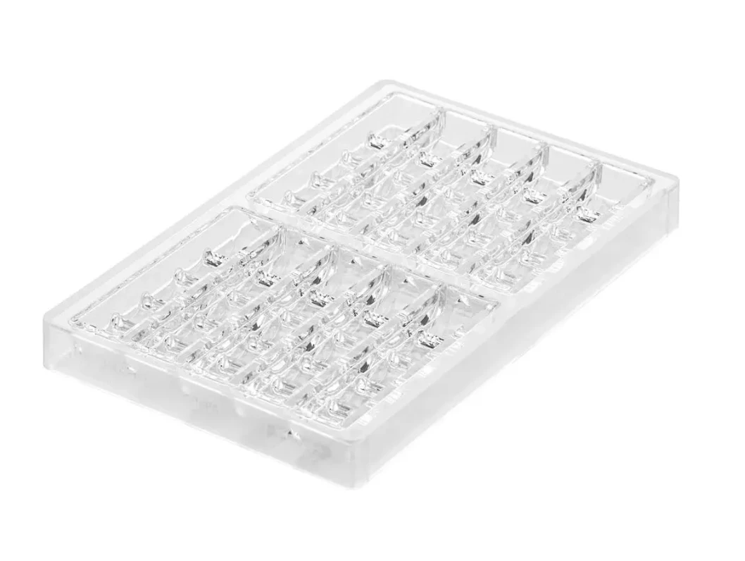 De Silikomart Sinfonia bakvorm bevat verschillende lagwerpige vormen met uitsparing voor het maken van bijvoorbeeld een gevulde chocoladereep. De transparante siliconen bakvorm is geschikt voor gebruik in de diepvries.