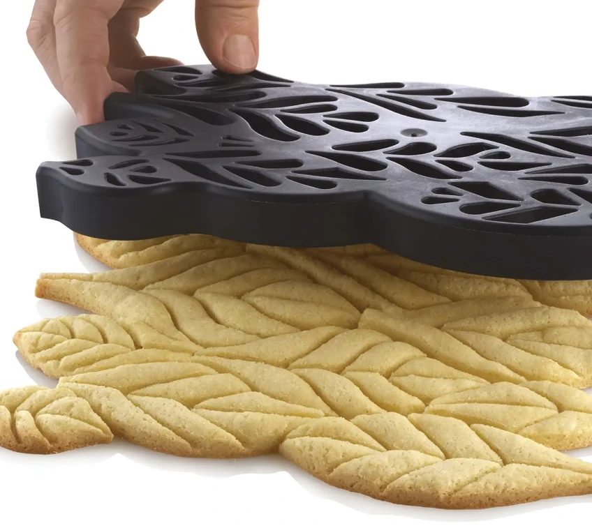 De Silikomart Voila koekjes bakvorm bevat verschillende bladvormen met uitsparing voor het uitdrukken van koekdeeg of fondant. De kunststof bakvorm is geschikt voor gebruik in de oven en de diepvries.