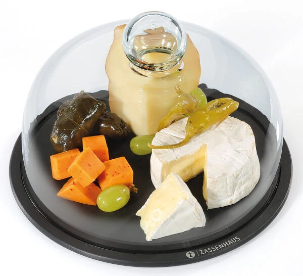 De Zassenhaus kaasstolp is gemaakt van glas en heeft een klassiek ronde koepelvorm. De houten plank is voorzien van een gleuf waar de stolp in rust. De plank heeft een diameter van 23 cm en de glazen stolp een diameter van 22 cm. Gebruik de plank om uw kaasplankje op te serveren en dek deze af met de stolp.
